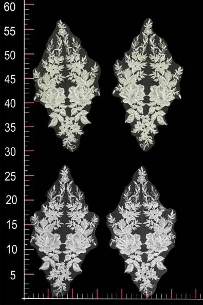 Aplikacja zdobiona, stworzona z eleganckiej koronki oraz niepowtarzalnych, rozświetlających naszywkę dodatków. Cały design produktu pozwala wykorzystać go jako wyjątkowy element dekoracyjny sukni wieczorowej, koktajlowej lub ślubnej.