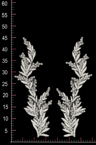Aplikacja zdobiona, stworzona z eleganckiej koronki oraz niepowtarzalnych, rozświetlających naszywkę dodatków. Cały design produktu pozwala wykorzystać go jako wyjątkowy element dekoracyjny sukni wieczorowej, koktajlowej lub ślubnej.