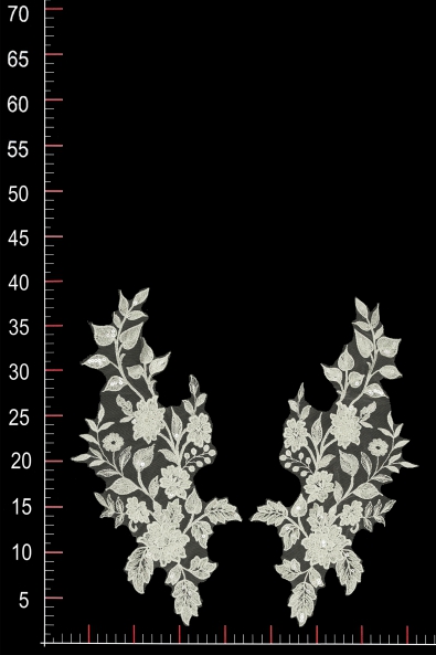 Aplikacja zdobiona, stworzona z eleganckiej koronki oraz niepowtarzalnych, rozświetlających naszywkę dodatków. Cały design produktu pozwala wykorzystać go jako wyjątkowy element dekoracyjny sukni wieczorowej, koktajlowej lub ślubnej.