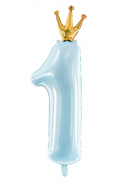 Metalizowany balon foliowy Cyfra 1 w kolorze błękitnym z koroną w kolorze złotym, wymiary przed napompowaniem ok. 37 x 100 cm (15 x 39''), wymiary po napompowaniu ok. 30 x 92 cm (12 x 36''). Do napompowania powietrzem i helem.