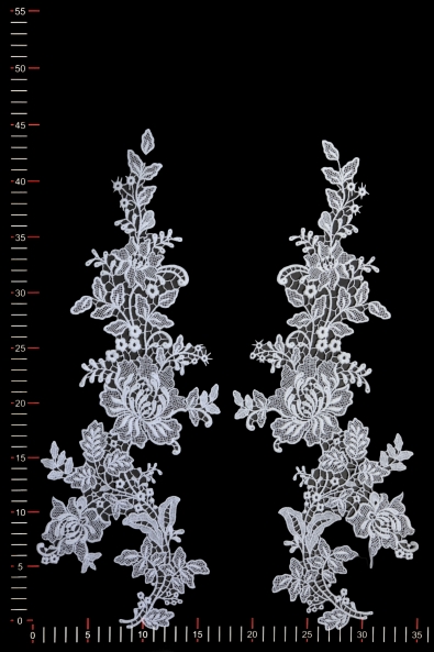 Wysokiej jakości aplikacja niezdobiona wykonana z gipiury. Wyróżnia się solidną formą, wyraźnym kształtem oraz szerokimi oczkami koronki. Naszyta na suknię ślubną, wieczorową czy koktajlową nadaje jej indywidualnego i niepowtarzalnego charakteru.