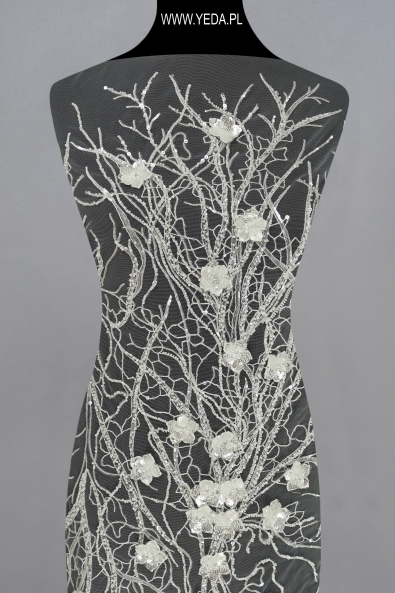 Wysokiej jakości koronka zdobiona wyróżniająca się niebanalnym wzorem oraz dekoracyjnymi detalami. Stworzona została z myślą o najbardziej wymagających kobietach, którym zależy na uzyskaniu wyjątkowej i efektownej stylizacji. Prezentowana koronka świetnie sprawdzi się jako baza ślubnej lub wieczorowej kreacji. Swój urok zawdzięcza znajdującym się na niej detalom. Odbijają one światło i rozświetlają materiał, a w konsekwencji przykuwają spojrzenia.