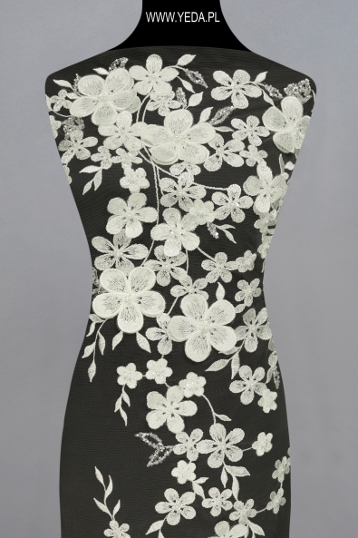 Wysokiej jakości koronka zdobiona wyróżniająca się niebanalnym wzorem oraz dekoracyjnymi detalami. Stworzona została z myślą o najbardziej wymagających kobietach, którym zależy na uzyskaniu wyjątkowej i efektownej stylizacji. Prezentowana koronka świetnie sprawdzi się jako baza ślubnej lub wieczorowej kreacji. Swój urok zawdzięcza znajdującym się na niej detalom. Odbijają one światło i rozświetlają materiał, a w konsekwencji przykuwają spojrzenia.