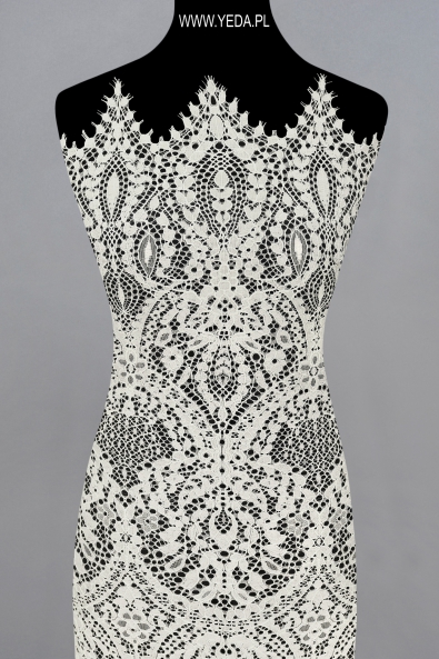Kobieca i elegancka koronka niezdobiona wyróżniająca się najwyższą jakością wykonania. Wyjątkowy deseń sprawia, że materiał ten doskonale sprawdzi się jako część koktajlowej, wieczorowej, a nawet ślubnej kreacji. Głównym walorem estetycznym tego produktu jest właśnie wspomniany wzór, ponieważ na koronce nie pojawiają się żadne dodatkowe zdobienia. Ten materiał doskonale pasuje do kobiet, które cenią klasyczny styl i płynącą z niego subtelną elegancję.