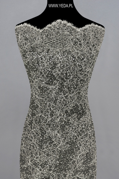 Wysokiej jakości koronka zdobiona wyróżniająca się niebanalnym wzorem oraz dekoracyjnymi detalami. Stworzona została z myślą o najbardziej wymagających kobietach, którym zależy na uzyskaniu wyjątkowej i efektownej stylizacji. Prezentowana koronka świetnie sprawdzi się jako baza ślubnej lub wieczorowej kreacji. Swój urok zawdzięcza znajdującym się na niej detalom. Odbijają one światło i rozświetlają materiał, a w konsekwencji przykuwają spojrzenia.