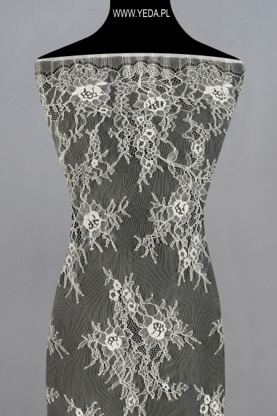 Kobieca i elegancka koronka niezdobiona wyróżniająca się najwyższą jakością wykonania. Wyjątkowy deseń sprawia, że materiał ten doskonale sprawdzi się jako część koktajlowej, wieczorowej, a nawet ślubnej kreacji. Głównym walorem estetycznym tego produktu jest właśnie wspomniany wzór, ponieważ na koronce nie pojawiają się żadne dodatkowe zdobienia. Ten materiał doskonale pasuje do kobiet, które cenią klasyczny styl i płynącą z niego subtelną elegancję.