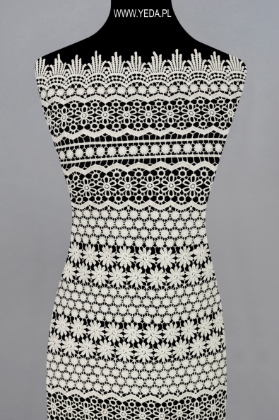 Kobieca i elegancka koronka niezdobiona wyróżniająca się najwyższą jakością wykonania. Wyjątkowy deseń sprawia, że materiał ten doskonale sprawdzi się jako część koktajlowej, wieczorowej, a nawet ślubnej kreacji. Głównym walorem estetycznym tego produktu jest właśnie wspomniany wzór, ponieważ na koronce nie pojawiają się żadne dodatkowe zdobienia. Ten materiał doskonale pasuje do kobiet, które cenią klasyczny styl i płynącą z niego subtelną elegancję.