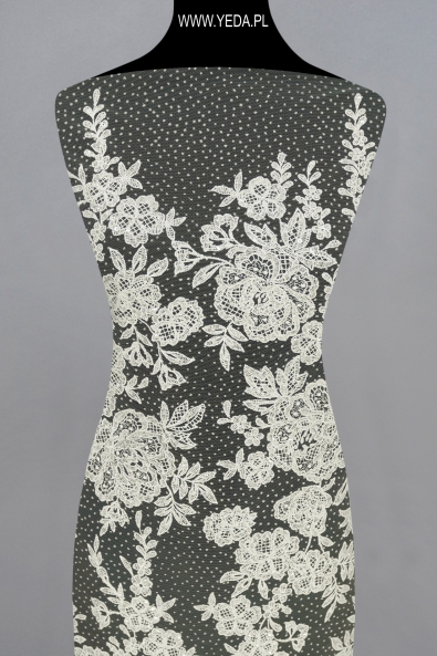 Wysokiej jakości koronka zdobiona wyróżniająca się niebanalnym wzorem oraz dekoracyjnymi detalami. Stworzona została z myślą o najbardziej wymagających kobietach, którym zależy na uzyskaniu wyjątkowej i efektownej stylizacji. Prezentowana koronka świetnie sprawdzi się jako baza ślubnej lub wieczorowej kreacji. Swój urok zawdzięcza znajdującym się na niej detalom. Odbijają one światło i rozświetlają materiał, a w konsekwencji przykuwają spojrzenia.