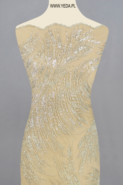 Wysokiej jakości zdobiona koronka wieczorowa stworzona z myślą o kobietach, które cenią elegancję. Wyjątkowy wzór wyhaftowany został na tiulu, a następnie ozdobiony efektownymi detalami. Tego typu materiał przyciąga spojrzenia i nadaje użytkowniczce uwodzicielskiego charakteru. Taka koronka to podstawa klasycznej sukienki wieczorowej lub koktajlowej