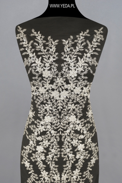 Wysokiej jakości koronka zdobiona wyróżniająca się niebanalnym wzorem oraz dekoracyjnymi detalami. Stworzona została z myślą o najbardziej wymagających kobietach, którym zależy na uzyskaniu wyjątkowej i efektownej stylizacji. Prezentowana koronka świetnie sprawdzi się jako baza ślubnej lub wieczorowej kreacji. Swój urok zawdzięcza znajdującym się na niej detalom. Odbijają one światło i rozświetlają materiał, a w konsekwencji przykuwają spojrzenia.