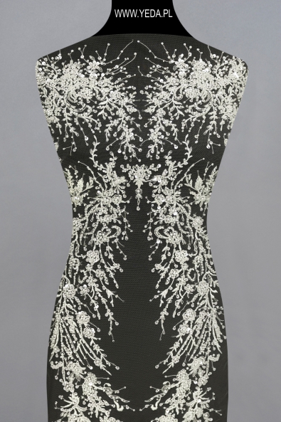 Wysokiej jakości koronka zdobiona wyróżniająca się niebanalnym wzorem oraz dekoracyjnymi detalami. Stworzona została z myślą o najbardziej wymagających kobietach, którym zależy na uzyskaniu wyjątkowej i efektownej stylizacji. Prezentowana koronka świetnie sprawdzi się jako baza ślubnej lub wieczorowej kreacji. Swój urok zawdzięcza znajdującym się na niej detalom. Odbijają one światło i rozświetlają materiał, a w konsekwencji przykuwają spojrzenia.