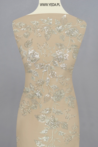Wysokiej jakości koronka zdobiona wyróżniająca się niebanalnym wzorem oraz dekoracyjnymi detalami. Stworzona została z myślą o najbardziej wymagających kobietach, którym zależy na uzyskaniu wyjątkowej i efektownej stylizacji. Prezentowana koronka świetnie sprawdzi się jako baza ślubnej lub wieczorowej kreacji. Swój urok zawdzięcza znajdującym się na niej detalom. Odbijają one światło i rozświetlają materiał, a w konsekwencji przykuwają spojrzenia.