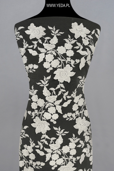 Wysokiej jakości koronka zdobiona wyróżniająca się niebanalnym wzorem oraz dekoracyjnymi detalami. Stworzona została z myślą o najbardziej wymagających kobietach, którym zależy na uzyskaniu wyjątkowej i efektownej stylizacji. Prezentowana koronka świetnie sprawdzi się jako baza ślubnej lub wieczorowej kreacji. Swój urok zawdzięcza znajdującym się na niej detalom. Odbijają one światło i rozświetlają materiał, a w konsekwencji przykuwają spojrzenia.