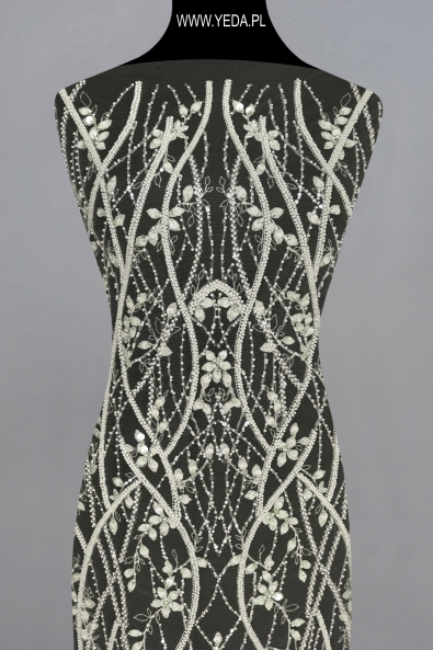 Wysokiej jakości koronka zdobiona wyróżniająca się niebanalnym wzorem oraz dekoracyjnymi detalami. Stworzona została z myślą o najbardziej wymagających kobietach, którym zależy na uzyskaniu wyjątkowej i efektownej stylizacji. Prezentowana koronka świetnie sprawdzi się jako baza ślubnej lub wieczorowej kreacji. Swój urok zawdzięcza znajdującym się na niej detalom. Odbijają one światło i rozświetlają materiał, a w konsekwencji przykuwają spojrzenia.