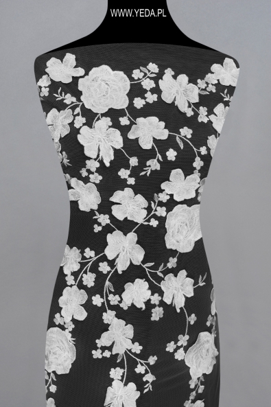 Kobieca i elegancka koronka niezdobiona wyróżniająca się najwyższą jakością wykonania. Wyjątkowy deseń sprawia, że materiał ten doskonale sprawdzi się jako część koktajlowej, wieczorowej, a nawet ślubnej kreacji. Głównym walorem estetycznym tego produktu jest właśnie wspomniany wzór, ponieważ na koronce nie pojawiają się żadne dodatkowe zdobienia. Ten materiał doskonale pasuje do kobiet, które cenią klasyczny styl i płynącą z niego subtelną elegancję.