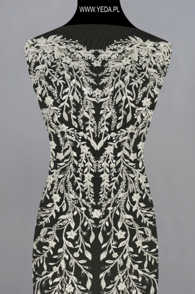 Wysokiej jakości koronka zdobiona wyróżniająca się niebanalnym wzorem oraz dekoracyjnymi detalami. Stworzona została z myślą o najbardziej wymagających kobietach, którym zależy na uzyskaniu wyjątkowej i efektownej stylizacji. Prezentowana koronka świetnie sprawdzi się jako baza ślubnej lub wieczorowej kreacji. Swój urok zawdzięcza znajdującym się na niej detalom. Odbijają one światło i rozświetlają materiał, a w konsekwencji przykuwają spojrzenia.