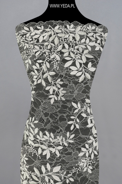 Wysokiej jakości koronka zdobiona wyróżniająca się niebanalnym wzorem oraz dekoracyjnymi detalami. Stworzona została z myślą o najbardziej wymagających kobietach, którym zależy na uzyskaniu wyjątkowej i efektownej stylizacji. Prezentowana koronka świetnie sprawdzi się jako baza ślubnej lub wieczorowej kreacji. Swój urok zawdzięcza znajdującym się na niej detalom. Odbijają one światło i rozświetlają materiał, a w konsekwencji przykuwają spojrzenia.