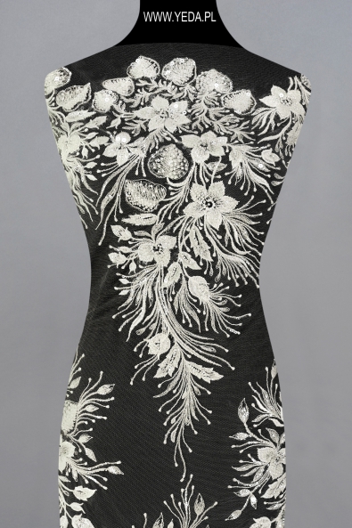 Wysokiej jakości koronka zdobiona wyróżniająca się niebanalnym wzorem oraz dekoracyjnymi detalami. Stworzona została z myślą o najbardziej wymagających kobietach, którym zależy na uzyskaniu wyjątkowej i efektownej stylizacji. Prezentowana koronka świetnie sprawdzi się jako baza ślubnej lub wieczorowej kreacji. Swój urok zawdzięcza znajdującym się na niej detalom. Odbijają one światło i rozświetlają materiał, a w konsekwencji przykuwają spojrzenia.