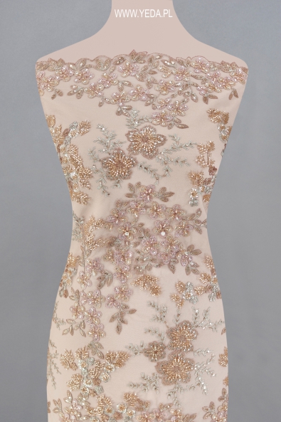 Wysokiej jakości zdobiona koronka wieczorowa stworzona z myślą o kobietach, które cenią elegancję. Wyjątkowy wzór wyhaftowany został na tiulu, a następnie ozdobiony efektownymi detalami. Tego typu materiał przyciąga spojrzenia i nadaje użytkowniczce uwodzicielskiego charakteru. Taka koronka to podstawa klasycznej sukienki wieczorowej lub koktajlowej