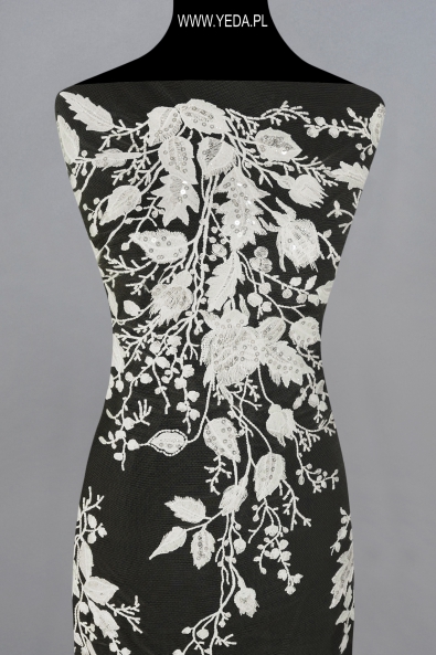 Wysokiej jakości koronka zdobiona wyróżniająca się niebanalnym wzorem oraz dekoracyjnymi detalami. Stworzona została z myślą o najbardziej wymagających kobietach, którym zależy na uzyskaniu wyjątkowej i efektownej stylizacji. Prezentowana koronka świetnie sprawdzi się jako baza ślubnej lub wieczorowej kreacji. Swój urok zawdzięcza znajdującym się na niej detalom. Odbijają one światło i rozświetlają materiał, a w konsekwencji przykuwają spojrzenia.