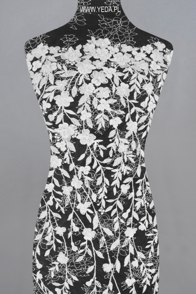 Wysokiej jakości koronka zdobiona wyróżniająca się niebanalnym wzorem oraz dekoracyjnymi detalami. Stworzona została z myślą o najbardziej wymagających kobietach, którym zależy na uzyskaniu wyjątkowej i efektownej stylizacji. Prezentowana koronka świetnie sprawdzi się jako baza ślubnej lub wieczorowej kreacji. Swój urok zawdzięcza znajdującym się na niej detalom. Odbijają one światło i rozświetlają materiał, a w konsekwencji przykuwają spojrzenia.