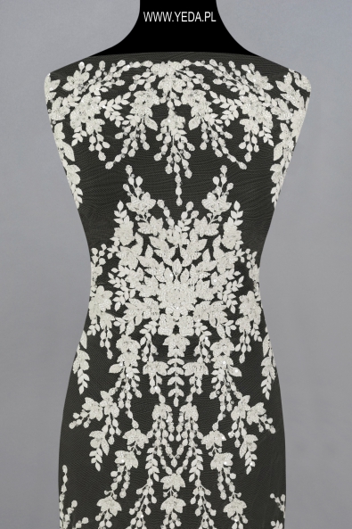 Wysokiej jakości koronka zdobiona wyróżniająca się niebanalnym wzorem oraz dekoracyjnymi detalami. Stworzona została z myślą o najbardziej wymagających kobietach, którym zależy na uzyskaniu wyjątkowej i efektownej stylizacji. Prezentowana koronka świetnie sprawdzi się jako baza ślubnej lub wieczorowej kreacji. Swój urok zawdzięcza znajdującym się na niej detalom. Odbijają one światło i rozświetlają materiał, a w konsekwencji przykuwają spojrzenia.