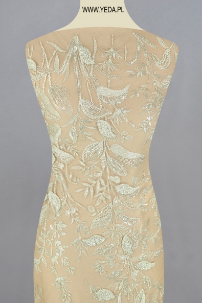 Wysokiej jakości zdobiona koronka wieczorowa stworzona z myślą o kobietach, które cenią elegancję. Wyjątkowy wzór wyhaftowany został na tiulu, a następnie ozdobiony efektownymi detalami. Tego typu materiał przyciąga spojrzenia i nadaje użytkowniczce uwodzicielskiego charakteru. Taka koronka to podstawa klasycznej sukienki wieczorowej lub koktajlowej
