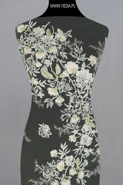 Wysokiej jakości koronka zdobiona wyróżniająca się niebanalnym wzorem oraz dekoracyjnymi detalami. Stworzona została z myślą o najbardziej wymagających kobietach, którym zależy na uzyskaniu wyjątkowej i efektownej stylizacji. Prezentowana koronka świetnie sprawdzi się jako baza ślubnej lub wieczorowej kreacji. Swój urok zawdzięcza znajdującym się na niej detalom. Odbijają one światło i rozświetlają materiał, a w konsekwencji przykuwają spojrzenia.
