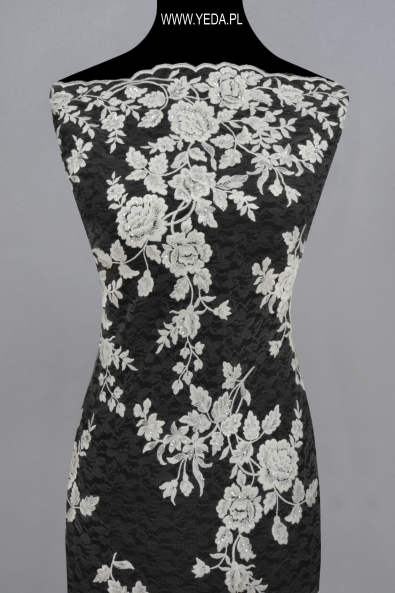 Koronka zdobiona transparentnymi cekinami wyhaftowana na lekko elastycznym tiulu