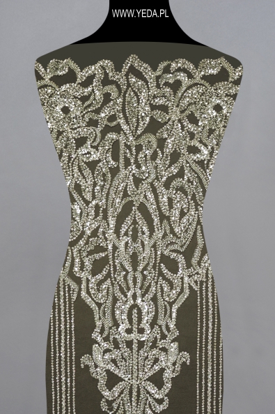 Wysokiej jakości koronka zdobiona wyróżniająca się niebanalnym wzorem oraz dekoracyjnymi detalami. Stworzona została z myślą o najbardziej wymagających kobietach, którym zależy na uzyskaniu wyjątkowej i efektownej stylizacji. Prezentowana koronka świetnie sprawdzi się jako baza ślubnej lub wieczorowej kreacji. Swój urok zawdzięcza znajdującym się na niej detalom. Odbijają one światło i rozświetlają materiał, a w konsekwencji przykuwają spojrzenia.