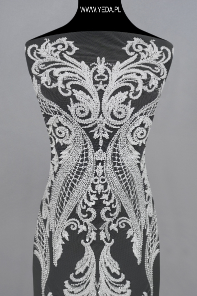 Wysokiej jakości koronka zdobiona wyróżniająca się niebanalnym wzorem oraz dekoracyjnymi detalami. Stworzona została z myślą o najbardziej wymagających kobietach, którym zależy na uzyskaniu wyjątkowej i efektownej stylizacji. Prezentowana koronka świetnie sprawdzi się jako baza ślubnej lub wieczorowej kreacji. Swój urok zawdzięcza znajdującym się na niej detalom. Odbijają one światło i rozświetlają materiał, a w konsekwencji przykuwają spojrzenia.