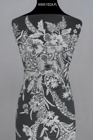 Wysokiej jakości koronka zdobiona wyróżniająca się niebanalnym wzorem oraz dekoracyjnymi detalami. Stworzona została z myślą o najbardziej wymagających kobietach, którym zależy na uzyskaniu wyjątkowej i efektownej stylizacji. Prezentowana koronka świetnie sprawdzi się jako baza ślubnej lub wieczorowej kreacji. Swój urok zawdzięcza znajdującym się na niej detalom. Odbijają one światło i rozświetlają materiał, a w konsekwencji przykuwają spojrzenia.