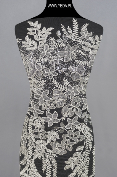 Wysokiej jakości koronka zdobiona wyróżniająca się niebanalnym wzorem oraz dekoracyjnymi detalami. Stworzona została z myślą o najbardziej wymagających kobietach, którym zależy na uzyskaniu wyjątkowej i efektownej stylizacji. Prezentowana koronka świetnie sprawdzi się jako baza ślubnej lub wieczorowej kreacji. Swój urok zawdzięcza znajdującym się na niej detalom. Odbijają one światło i rozświetlają materiał, a w konsekwencji przykuwają spojrzenia.
