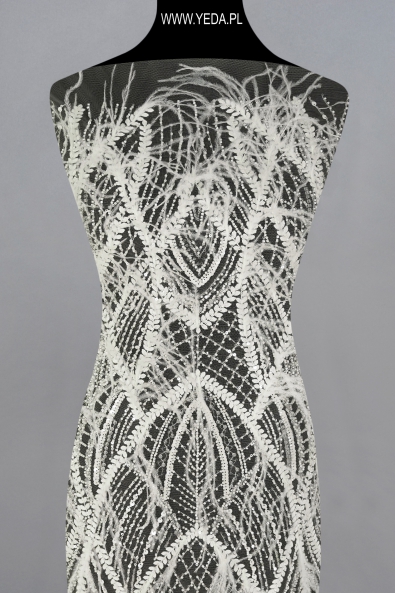 Wysokiej jakości koronka zdobiona wyróżniająca się niebanalnym wzorem oraz dekoracyjnymi detalami. Stworzona została z myślą o najbardziej wymagających kobietach, którym zależy na uzyskaniu wyjątkowej i efektownej stylizacji. Prezentowana koronka świetnie sprawdzi się jako baza ślubnej lub wieczorowej kreacji. Swój urok zawdzięcza znajdującym się na niej detalom. Odbijają one światło i rozświetlają materiał, a w konsekwencji przykuwają spojrzenia.