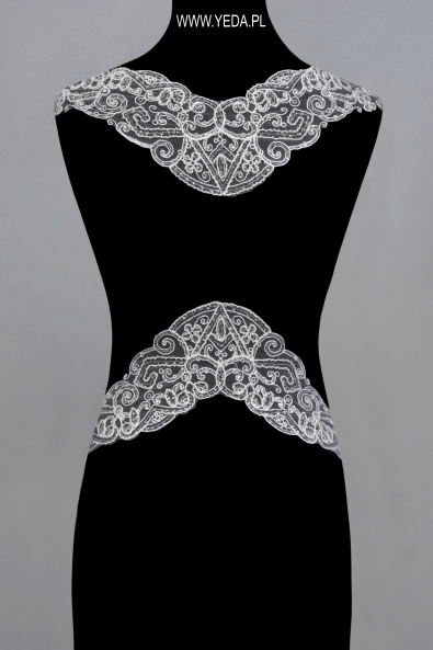 Aplikacja zdobiona,stworzona z eleganckiej koronki oraz niepowtarzalnych, rozświetlających naszywkę dodatków. Cały design produktu pozwala wykorzystać go jako wyjątkowy element dekoracyjny sukni wieczorowej, koktajlowej lub ślubnej