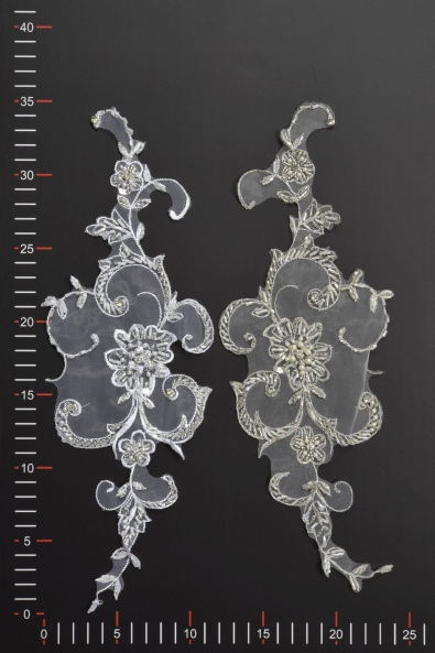 Aplikacja zdobiona, stworzona z eleganckiej koronki oraz niepowtarzalnych, rozświetlających naszywkę dodatków. Cały design produktu pozwala wykorzystać go jako wyjątkowy element dekoracyjny sukni wieczorowej, koktajlowej lub ślubnej.