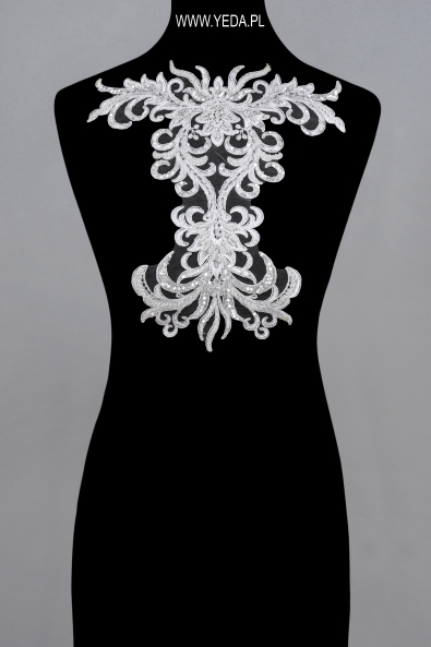 Aplikacja zdobiona,stworzona z eleganckiej koronki oraz niepowtarzalnych, rozświetlających naszywkę dodatków. Cały design produktu pozwala wykorzystać go jako wyjątkowy element dekoracyjny sukni wieczorowej, koktajlowej lub ślubnej.