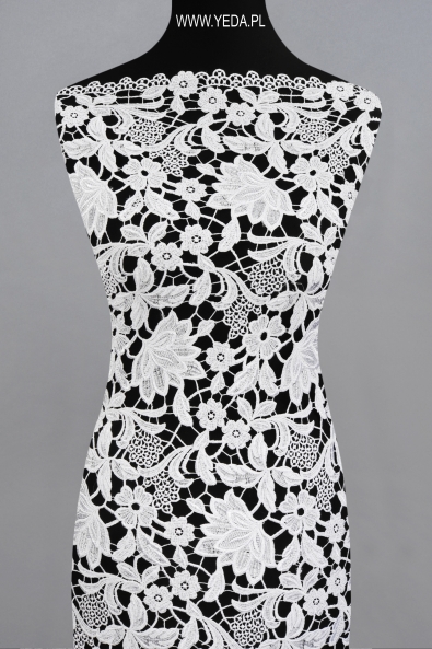 Wysokiej jakości koronka niezdobiona, stworzona z klasycznej gipiury. Wyróżnia się wypukłym i stylowym wzorem, który przyciąga spojrzenia. Sprawdzi się doskonale do stworzenia zachwycającej kreacji wieczorowej, ślubnej lub koktajlowej.