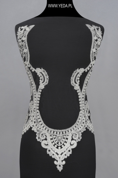Aplikacja zdobiona, stworzona z eleganckiej koronki oraz niepowtarzalnych, rozświetlających naszywkę dodatków. Cały design produktu pozwala wykorzystać go jako wyjątkowy element dekoracyjny sukni wieczorowej, koktajlowej lub ślubnej.