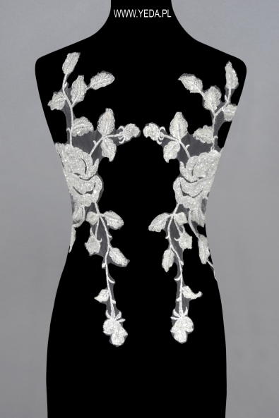 Aplikacja zdobiona,stworzona z eleganckiej koronki oraz niepowtarzalnych, rozświetlających naszywkę dodatków. Cały design produktu pozwala wykorzystać go jako wyjątkowy element dekoracyjny sukni wieczorowej, koktajlowej lub ślubnej.
