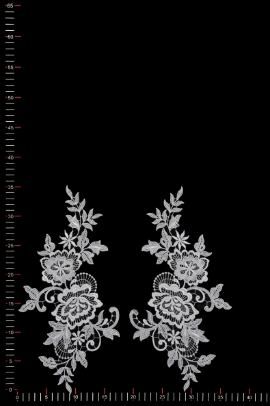 Wysokiej jakości aplikacja niezdobiona wykonana z gipiury. Wyróżnia się solidną formą, wyraźnym kształtem oraz szerokimi oczkami koronki. Naszyta na suknię ślubną, wieczorową czy koktajlową nadaje jej indywidualnego i niepowtarzalnego charakteru.