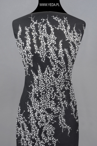Piękny zdobiony wzór wyhaftowany na delikatnym, lekko rozciągliwym tiulu. Idealnie nadaje się do tworzenia wyjątkowej sukni ślubnej lub komunijnej.