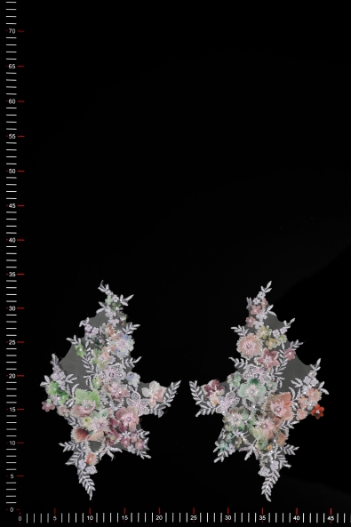 Aplikacja zdobiona, stworzona z eleganckiej koronki oraz niepowtarzalnych, rozświetlających naszywkę dodatków. Cały design produktu pozwala wykorzystać go jako wyjątkowy element dekoracyjny sukni wieczorowej, koktajlowej lub ślubnej.