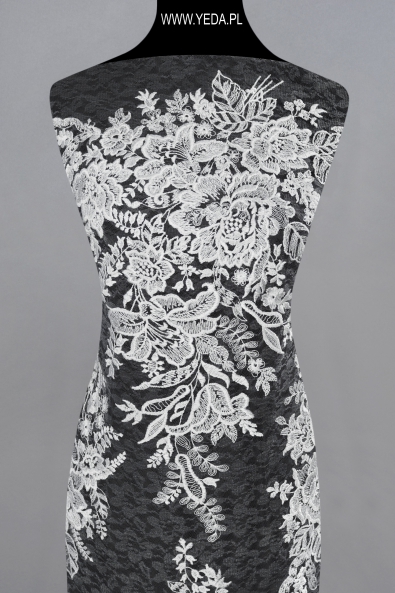 Kobieca i elegancka koronka niezdobiona wyróżniająca się najwyższą jakością wykonania. Wyjątkowy deseń sprawia, że materiał ten doskonale sprawdzi się jako część koktajlowej, wieczorowej, a nawet ślubnej kreacji. Głównym walorem estetycznym tego produktu jest właśnie wspomniany wzór, ponieważ na koronce nie pojawiają się żadne dodatkowe zdobienia. Ten materiał doskonale pasuje do kobiet, które cenią klasyczny styl i płynącą z niego subtelną elegancję.