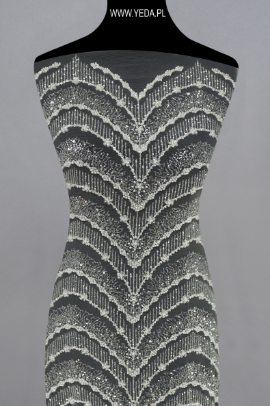 Wysokiej jakości koronka zdobiona wyróżniająca się niebanalnym wzorem oraz dekoracyjnymi detalami. Stworzona została z myślą o najbardziej wymagających kobietach, którym zależy na uzyskaniu wyjątkowej i efektownej stylizacji. Prezentowana koronka świetnie sprawdzi się jako baza ślubnej lub wieczorowej kreacji. Swój urok zawdzięcza znajdującym się na niej detalom. Odbijają one światło i rozświetlają materiał, a w konsekwencji przykuwają spojrzenia.