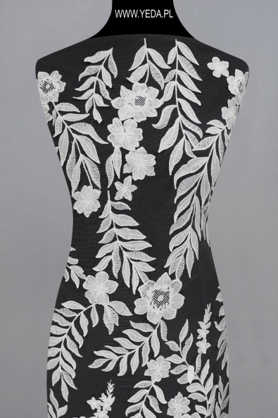 Kobieca i elegancka koronka niezdobiona wyróżniająca się najwyższą jakością wykonania. Wyjątkowy deseń sprawia, że materiał ten doskonale sprawdzi się jako część koktajlowej, wieczorowej, a nawet ślubnej kreacji. Głównym walorem estetycznym tego produktu jest właśnie wspomniany wzór, ponieważ na koronce nie pojawiają się żadne dodatkowe zdobienia. Ten materiał doskonale pasuje do kobiet, które cenią klasyczny styl i płynącą z niego subtelną elegancję.