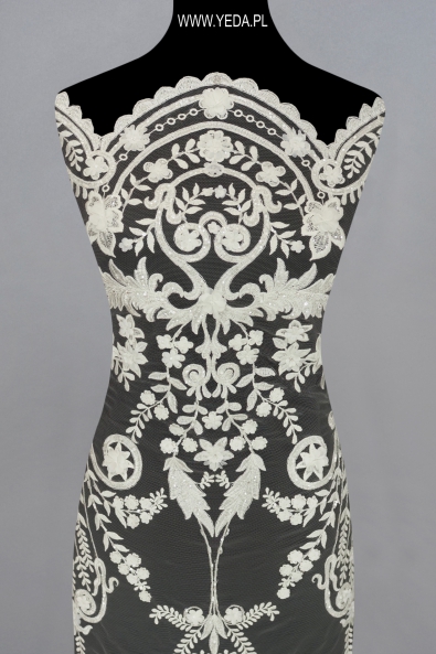 Wysokiej jakości koronka zdobiona wyróżniająca się niebanalnym wzorem oraz dekoracyjnymi detalami. Stworzona została z myślą o najbardziej wymagających kobietach, którym zależy na uzyskaniu wyjątkowej i efektownej stylizacji. Prezentowana koronka świetnie sprawdzi się jako baza ślubnej lub wieczorowej kreacji. Swój urok zawdzięcza znajdującym się na niej detalom. Odbijają one światło i rozświetlają materiał, a w konsekwencji przykuwają spojrzenia.