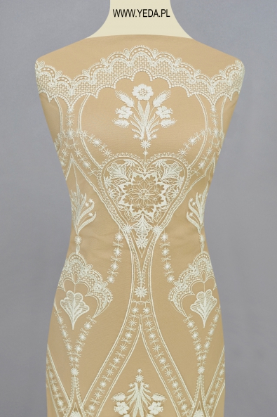 Kobieca i elegancka koronka niezdobiona wyróżniająca się najwyższą jakością wykonania. Wyjątkowy deseń sprawia, że materiał ten doskonale sprawdzi się jako część koktajlowej, wieczorowej, a nawet ślubnej kreacji. Głównym walorem estetycznym tego produktu jest właśnie wspomniany wzór, ponieważ na koronce nie pojawiają się żadne dodatkowe zdobienia. Ten materiał doskonale pasuje do kobiet, które cenią klasyczny styl i płynącą z niego subtelną elegancję.