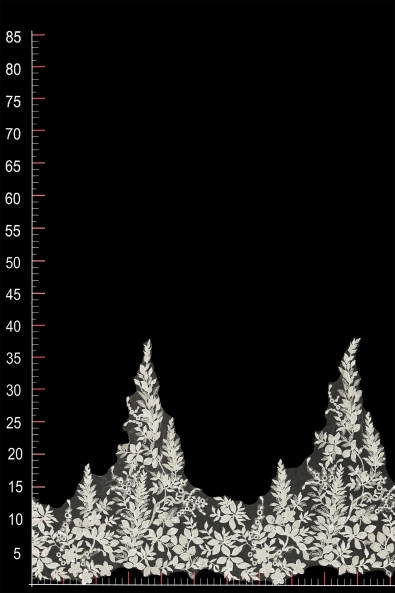 Wysokiej jakości taśma zdobiona, stworzona z nowoczesnej koronki 3D. Cechują ją wzory przestrzenne, które sprawiają, że przystrojona taśmą tkanina wyróżnia się niebanalną fakturą. Prezentowany model stanowi także niezwykle elegancki detal dekoracyjny. Cechę tę zawdzięcza umieszczonym na koronce dodatkowym zdobieniom.