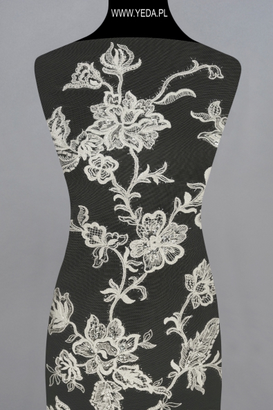 Wysokiej jakości koronka zdobiona wyróżniająca się niebanalnym wzorem oraz dekoracyjnymi detalami. Stworzona została z myślą o najbardziej wymagających kobietach, którym zależy na uzyskaniu wyjątkowej i efektownej stylizacji. Prezentowana koronka świetnie sprawdzi się jako baza ślubnej lub wieczorowej kreacji. Swój urok zawdzięcza znajdującym się na niej detalom. Odbijają one światło i rozświetlają materiał, a w konsekwencji przykuwają spojrzenia.